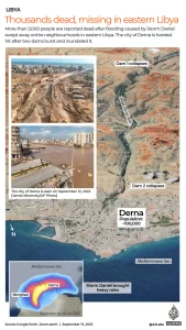 Şehrin yukarısındaki iki barajın patlamasıyla yaklaşık 100.000 nüfuslu şehri yerle bir eden tahmini 30 milyon metreküplük (39 milyon yarda küp) suyun serbest kalmasının ardından en ağır darbeyi Derna aldı.